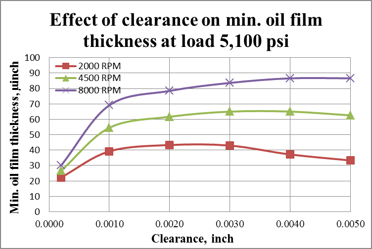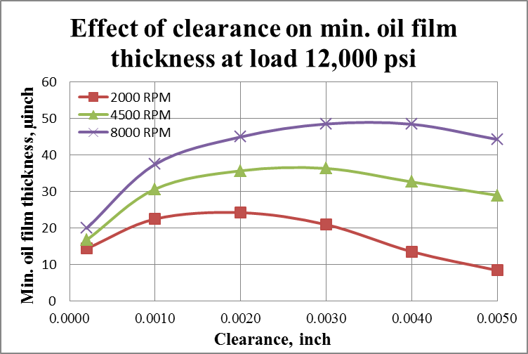 When the clearance increases from low values, the resulting value of min. oil film thickness also increases. This is due to the formation of a larger supporting oil wedge, which is mandatory for stable hydrodynamic lubrication.