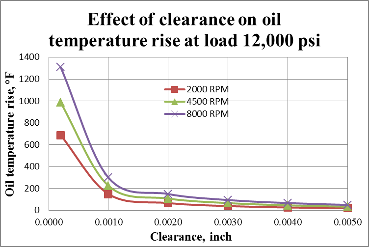 The third disadvantage of tight clearances is excessive heating of the oil. The friction energy generated by the bearing at high rotation speeds may heat the oil to a temperature above its maximum temperature limit (e.g. 500 °F for synthetic oil). The graphs in Fig. 7 illustrates the effect of clearance on oil temperature rise (delta T).
