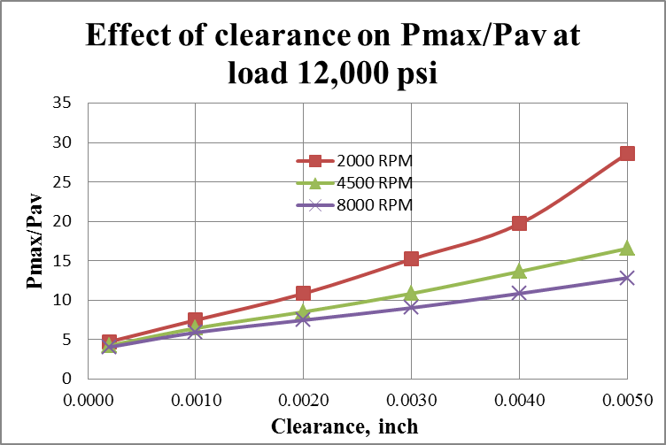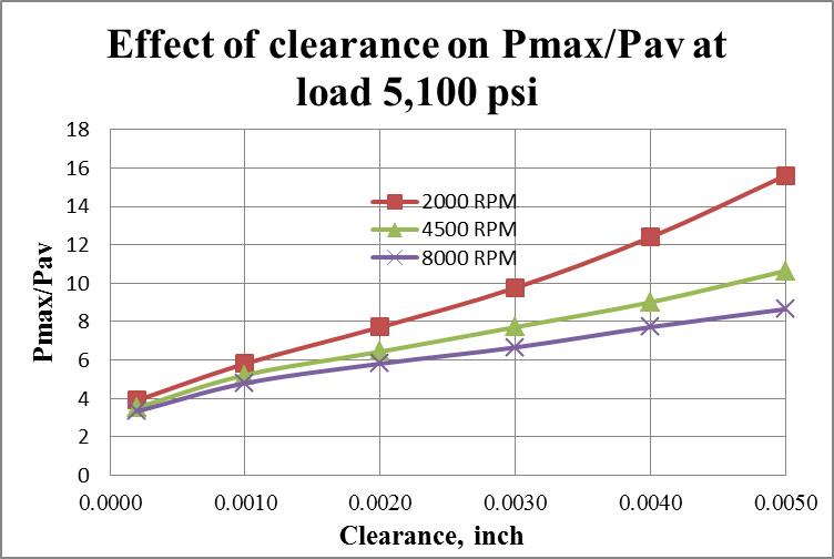 As seen in the graphs, clearance exceeding 0.003” may results in substantial non-homogeneity of the oil pressure distribution.